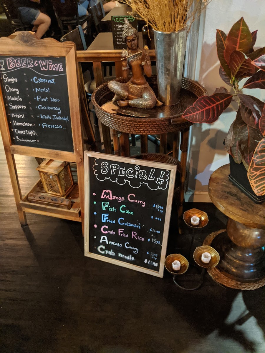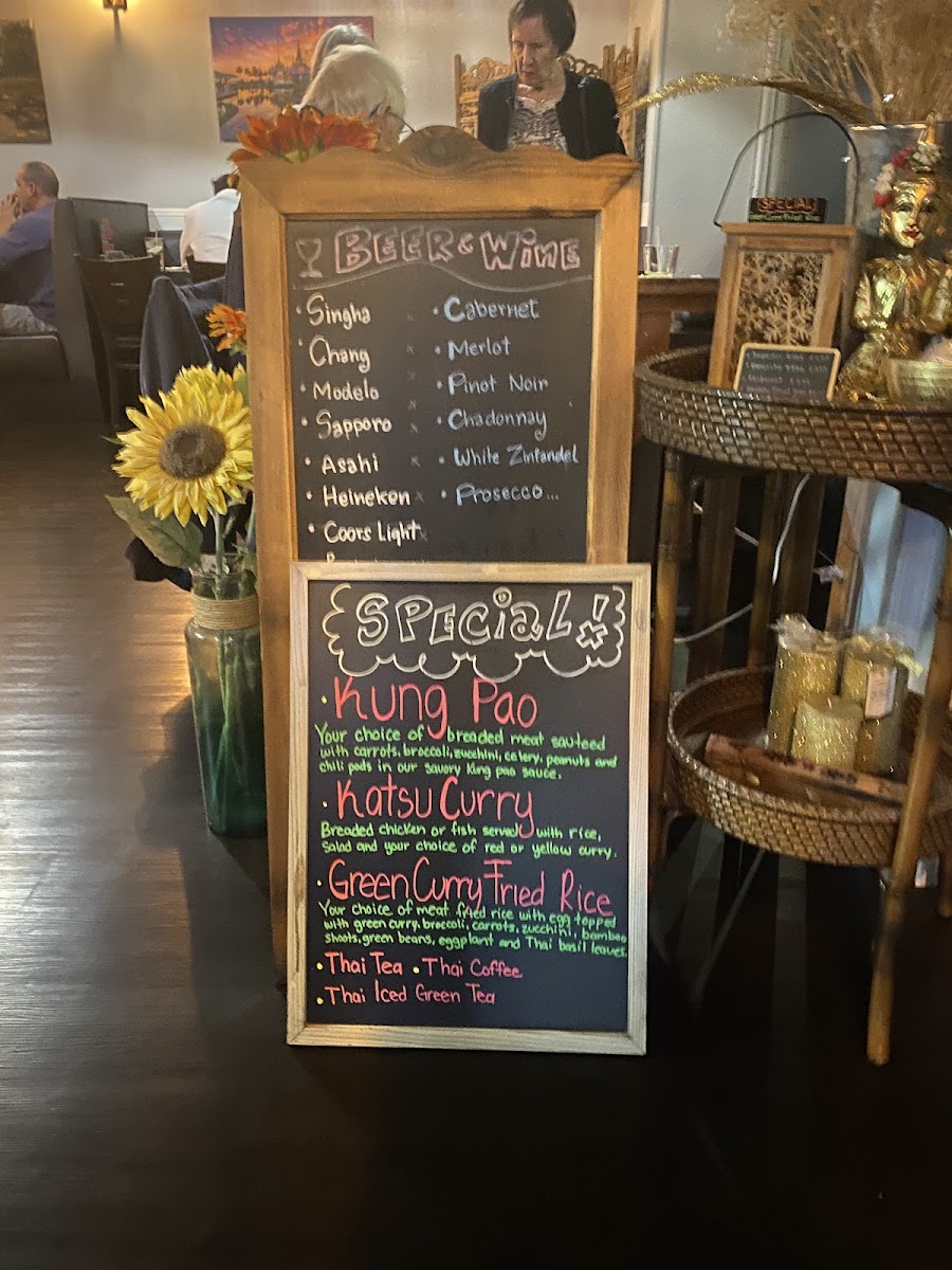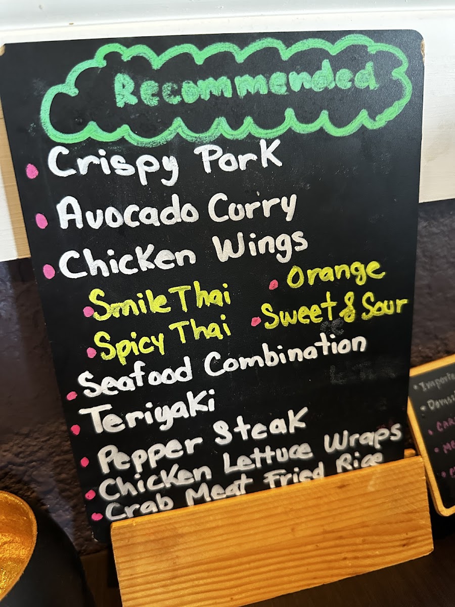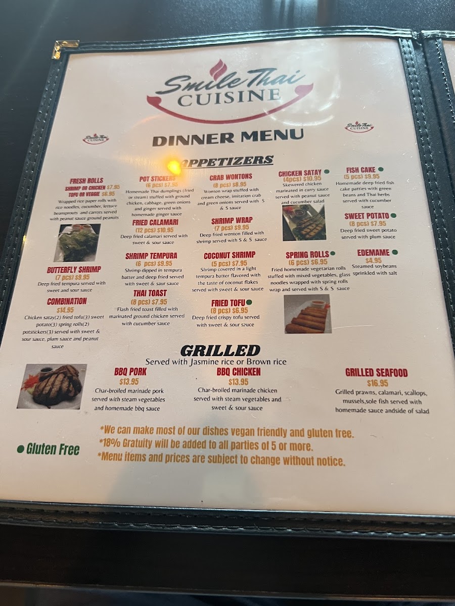 **UPDATE** 2/15/25: yep, still awesome! Arrived this Saturday around 4:30 to an empty restaurant. It slowly filled up, but never got crowded while we were there. We ordered a few different menu items (drunken noodles w/ beef, garlic w/ beef, & the summer rolls), along with our standard orders from any Thai restaurant (Thai tea, sticky rice, crab wontons). Same as our last visit, our server was superior but again I failed to get his name. He was a younger gentleman, extremely pleasant, smiling, and very friendly. 11/16/24 - everything about Smile Thai was spot on. This particular Saturday early evening we arrived around 4:00 to an empty restaurant. We were seated immediately and were able to enjoy some of their interior design. Loved all of it. It is part of a strip mall which means there is ample parking. There is a very small patio, maybe two, two-chair tables. It is not a large place but its interior is put together well so can accommodate quite a few people, I imagine. I failed to ask our server for his name, but he was exceptionally polite and checked in on us frequently, typically within a few minutes of delivering each plated item. We had the entire place to ourselves, but they did have a pretty hefty call-in and pick up action. The food? The bomb! The Thai tea was perfect, crab wontons hot and crisp, edamame well salted, hot & sour soup hot & sour, and Thai toast also crispy -- and plentiful on all of it. My only critique on the soup would be to have smaller chunks of tomatoes. We can never eat at a Thai restaurant without enjoying sticky rice for dessert. The server, however, saw us boxing up our meals to take home and brought over the check. We both laughed and said, "Oh no, we ARE getting dessert." He laughed with us and took our rice orders, one with mango and one with custard. Both were plated well with more mango and custard than many of the other places we have eaten. We will definitely eat at Smile Thai again, and whole heartedly suggest to anyone who asks that they try it, too.