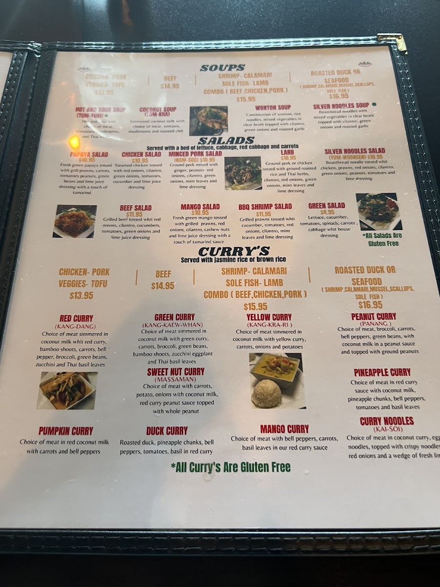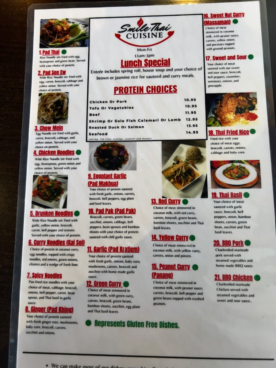 Smile Thai was a wonderful experience. The service was great with very friendly and attentive servers. Our food was very good. I'm not a curry expert, but I do know I love curry and this green curry was stellar. We also enjoyed the satay chicken for an appetizer and mango sticky rice for dessert!